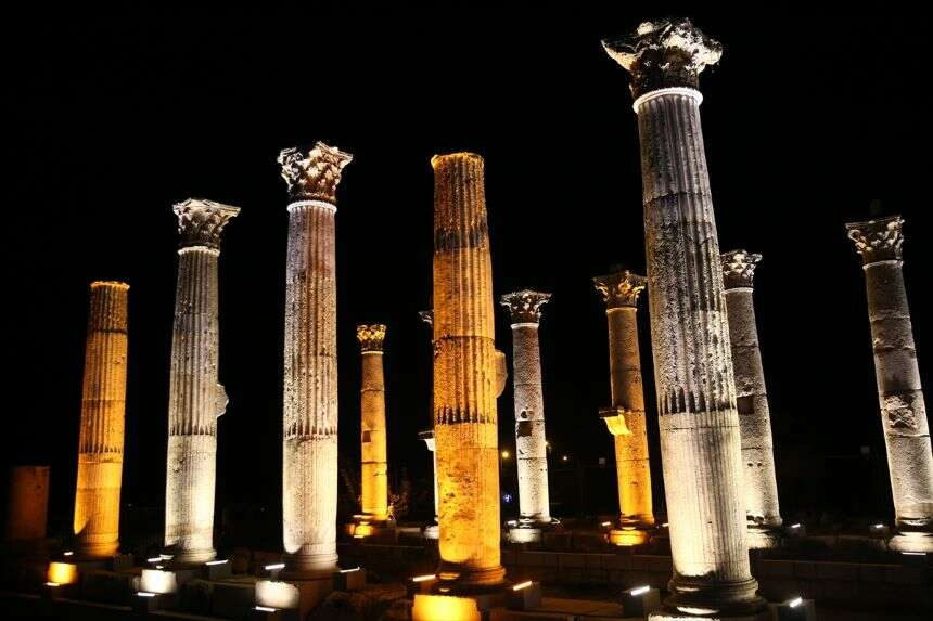 Tarihi milattan sonra 2. ve 3. yüzyıllara uzanan antik kentin sütunlarının manzarasında yürüyen mankenler, tasarımları sergiledi.