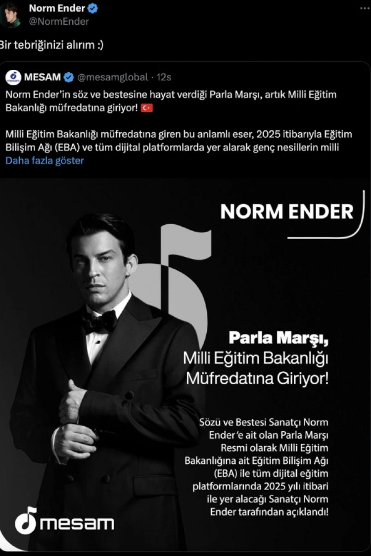 Cumhuriyet'in 100. yılı şerefine bestelediği "Parla" marşıyla büyük bir çıkış yakalayan Norm Ender'in eseri, 2025 yılından itibaren Milli Eğitim Bakanlığı müfredatına dahil edilecek. Eser, öğrencilere dijital platformlardan sunulacak.