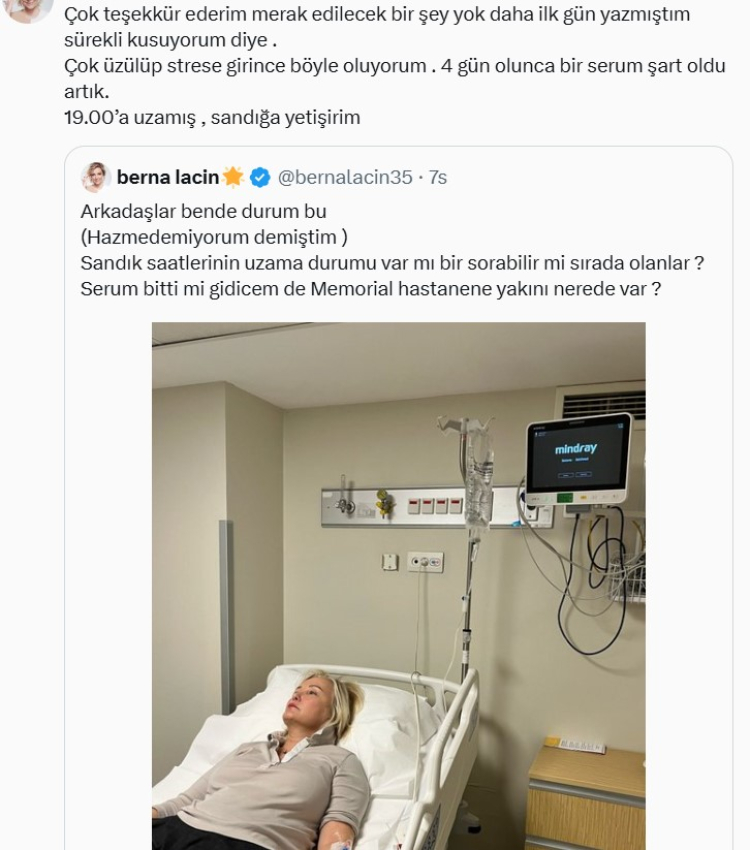 Ekrem İmamoğlu'nun tutuklanmasının ardından büyük bir rahatsızlık yaşayan Berna Laçin, sosyal medya hesabı üzerinden durumu hakkında açıklamalarda bulundu. Laçin, “Hazmedemiyorum demiştim” diyerek ülke gündemine dair duyduğu rahatsızlık ve stresin etkisiyle hastaneye kaldırıldığını belirtti.