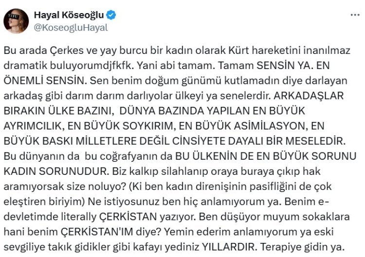 Tam da bu gelişmenin ardından oyuncu Hayal Köseoğlu’nun sosyal medya platformu X (eski adıyla Twitter) üzerinden yaptığı paylaşım gündemi sarstı. “Çerkes ve yay burcu bir kadın olarak Kürt hareketini inanılmaz dramatik buluyorum” ifadeleriyle başlayan uzun paylaşımında Köseoğlu, kadın hakları vurgusu yaparak “Biz kalkıp silahlanıp hak aramıyorsak size ne oluyor?” diyerek tepki çeken bir üslup kullandı.