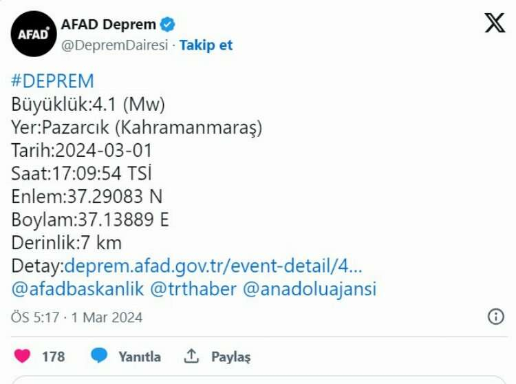 AFAD, Kahramanmaraş'ın Pazarcık ilçesinde saat 17.09'da 4.1 büyüklüğünde deprem meydana geldiğini bildirdi.