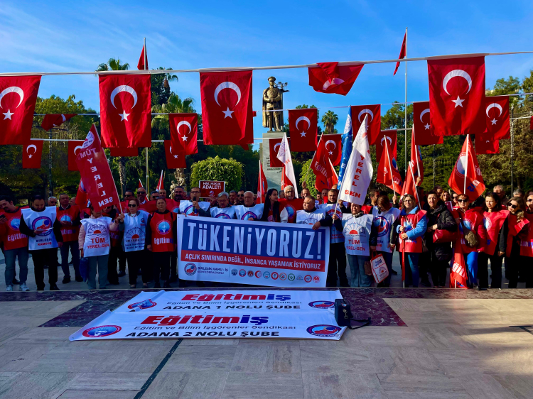 Birleşik Kamu-İş Konfederasyonu’na bağlı sendikalara üye kamu çalışanları iş bırakarak tepkilerini gösterdi. Adana’da Atatürk Parkı’nda bir araya gelen konfederasyon üyeleri, basın açıklaması yaptı. Açıklamayı katılanlar adına Birleşik Kamu-İş Konfederasyonu Adana İl Başkanı Hakan Şen okudu. Şen, toplumun ekonomik sıkıntılarına dikkat çekerek, “Bütçe, halkın ortak kaynağıdır. Bu kaynaktan en büyük pay emekçiler, emekliler, gençler ve engelliler başta olmak üzere yoksul halkımıza ayrılmalıdır” dedi.