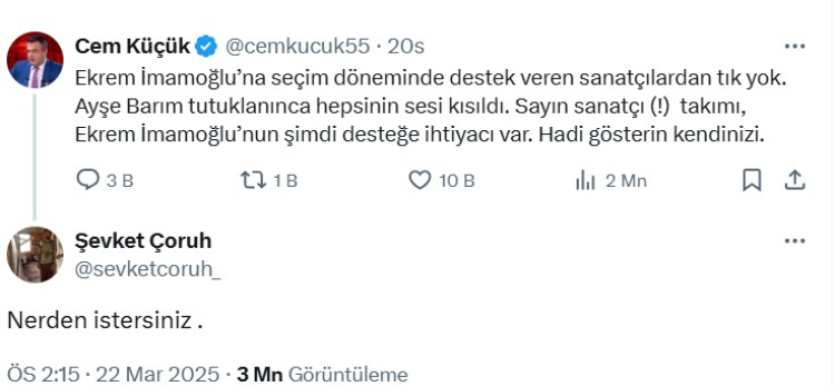Küçük, paylaşımında, “Ekrem İmamoğlu’na seçim döneminde destek veren sanatçılardan tık yok. Ayşe Barım tutuklanınca hepsinin sesi kısıldı. Sayın sanatçı (!) takımı, Ekrem İmamoğlu’nun şimdi desteğe ihtiyacı var. Hadi gösterin kendinizi” ifadelerini kullandı.