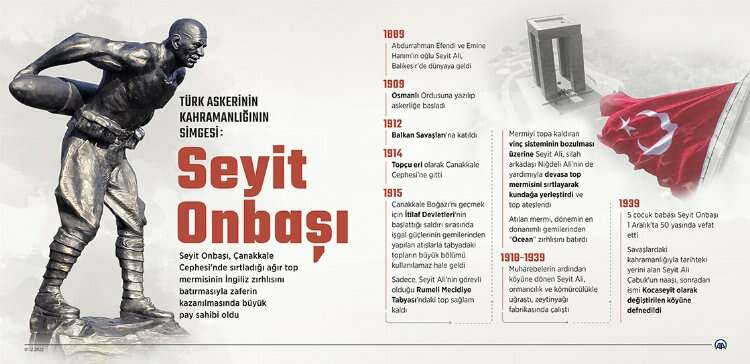 Seyit Onbaşı, Çanakkale cephesinde gösterdiği kahramanlıkla öne çıkan bir askerdir. Savaşın en kritik anlarında, çok ağır olduğu iddia edilen top mermilerini sırtlayarak kundağına yerleştirmesiyle tanınır. Bu olağanüstü cesaretiyle, İngiltere’ye ait Ocean Zırhlısı'nı batırarak savaşın seyrini değiştirmiştir.