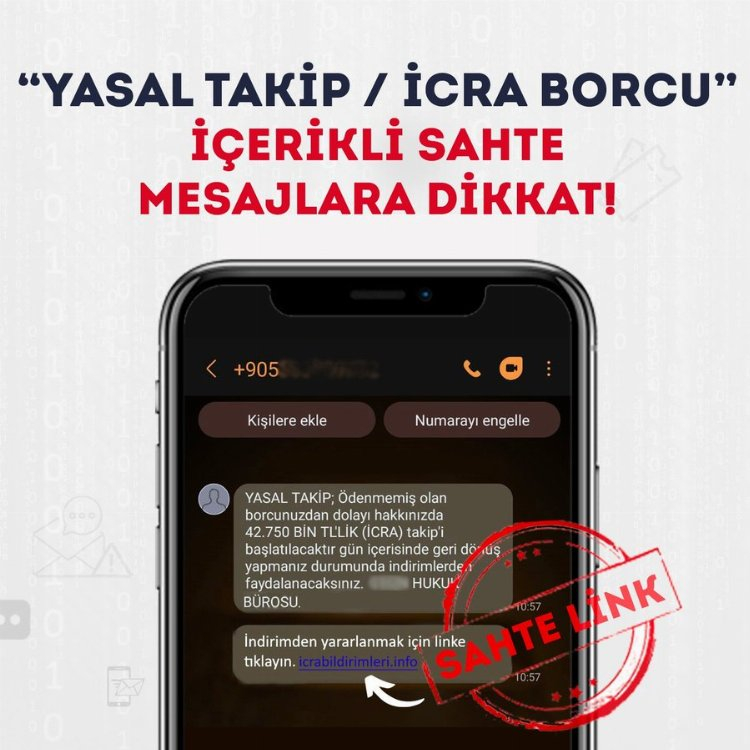 Sosyal medya hesabından yaptığı paylaşımda şu ifadelere yer verdi: “Yasal takip, hakkınızda icra takibi başlatılacaktır, indirim için başvuru yapın gibi ifadelerle oltalama amaçlı olarak iletilen asılsız mesajlara ve mesaj içeriğine sahte bağlantılara itibar etmeyin. Yönlendirilen sahte sitelerde kişisel/ finansal bilgilerinizi paylaşmayın ve herhangi bir ödeme yapmayın. Resmi işlemlerinizi UYAP vatandaşı portalı ve e-devlet kapısı üzerinden takip edin.”