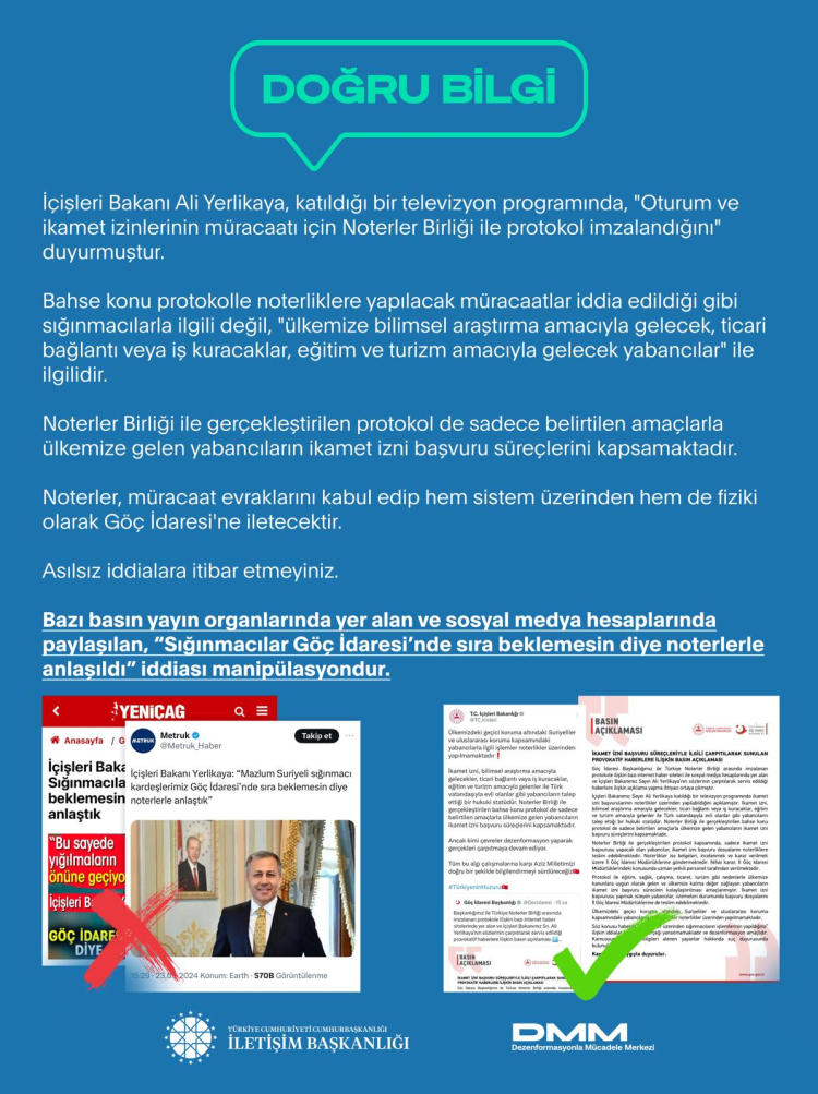 İletişim Başkanlığı'ndan yapılan açıklamada, "Sığınmacılar Göç İdaresi'nde sıra beklemesin diye noterlerle anlaşıldı" iddiasının gerçeği yansıtmadığı belirtildi. Dezenformasyonla Mücadele Merkezi'nden yapılan açıklamada, İçişleri Bakanı Ali Yerlikaya'nın bir televizyon programında yaptığı açıklamalara dikkat çekilerek, noterliklerle yapılan protokolden kasıtın sığınmacılar değil, bilimsel araştırma, ticaret, eğitim ve turizm amaçlı ülkemize gelen yabancılar olduğu vurgulandı.