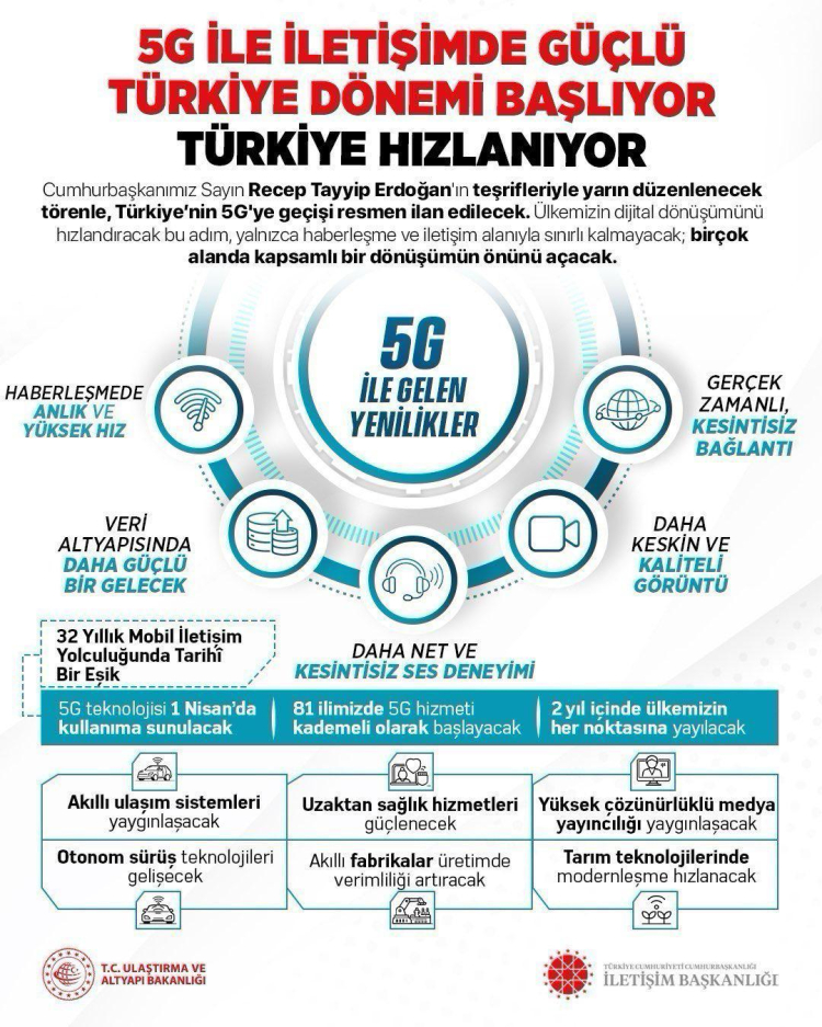 Açıklamada, 5G teknolojisinin yalnızca iletişim alanında değil; savunma sanayii, sağlık, ulaştırma ve akıllı şehir uygulamaları gibi birçok sektörde önemli dönüşümler sağlayacağına dikkat çekildi. Düşük gecikme süresi ve yüksek veri kapasitesi sayesinde kamu hizmetlerinde verimliliğin artması hedefleniyor.