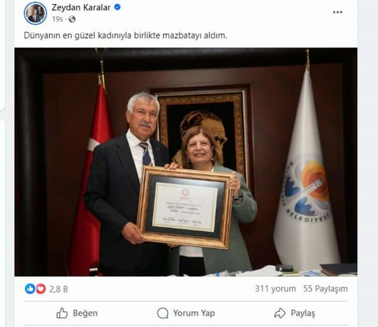 Yerel seçimlerde yeniden Adana Büyükşehir Belediye Başkanı seçilen CHP'li Zeydan Karalar, mazbatasını Seçim Kurulu'ndan aldı. Başkan Karalar’ın, eşi Nuray Karalar ile mazbatayla çekilen fotoğrafını "Dünyanın en güzel kadınıyla birlikte mazbatayı aldım." ifadesiyle sosyal medyadaki övgü dolu paylaşımı, büyük ilgi çekti.