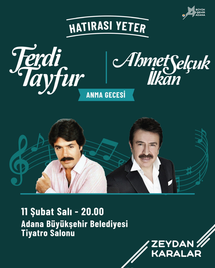 Türk müziğinin unutulmaz isimlerinden Ferdi Tayfur, Antalya'da tedavi gördüğü hastanede 79 yaşında hayatını kaybetti. Sanatçının memleketi Adana'da, Tayfur’un vefat haberini duyan sevenleri büyük bir üzüntü yaşadı. Adana Büyükşehir Belediyesi, Ferdi Tayfur’un hatırasını yaşatmak amacıyla anma gecesi düzenleyecek. 11 Şubat Salı günü saat 20.00’de Adana Büyükşehir Belediyesi Tiyatro Salonu’nda gerçekleştirilecek etkinlikte, ünlü söz yazarı Ahmet Selçuk İlkan da yer alacak. Gece boyunca Tayfur’un bestelediği unutulmaz arabesk şarkılar seslendirilecek.
