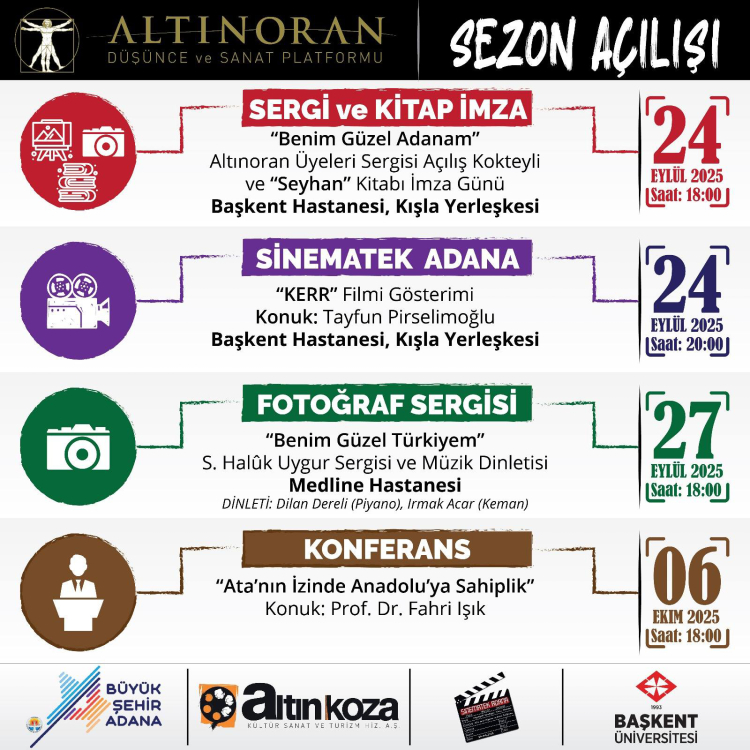 Altınoran Düşünce ve Sanat Derneği’nin Adana Büyükşehir Belediyesi, Altın Koza, Sinematek Adana ve Başkent Üniversitesi katkılarıyla gerçekleştireceği yeni sezon programında yer alan etkinlikler, Adana’nın kültürel çeşitliliğini ve sanatsal birikimini yansıtmayı amaçlıyor.
