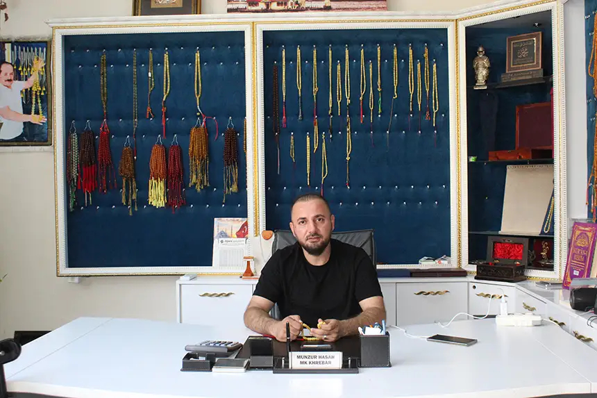 "Ben 7 yıldan fazla bir süredir bu işin içerisindeyim. Ama ailecek 20 yıldan fazladır bu işi yapıyoruz" diyerek söze başlayan Hasan, "Tesbihlerden genel olarak bahsedecek olursak ateş kehribar ve sıkma kehribar en çok satılan, istenilen modellerden. Biz, insan eliyle yapılmış olan kehribarlara 'ateş ve sıkma kehribar' diyoruz. Bu ikisi dışında bir de damla kehribarlar var. O damla kehribarlar da milyon yıllık reçinelerdir. Bildiğimiz ağacın reçinesi. Bunlar genelde dünyada 4 ülkede bulunmaktadır; Ukrayna, Litvanya, Polonya ve Rusya. Yani Baltık ülkelerinden geliyor. Türkiye'de yok. Genelde buzulların çok olduğu yerde çıkıyor" dedi.