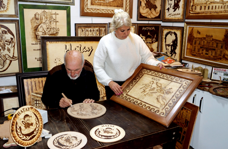 Hatay Arkeoloji Müzesi’nde sergilenen dünyaca ünlü mozaikleri yakma tekniğiyle ahşap yüzeylere aktaran Zeynep ve Naim Gülbol çifti, binlerce yıllık kültürel mirası modern sanatla buluşturarak geçmişi yeniden yorumluyor.