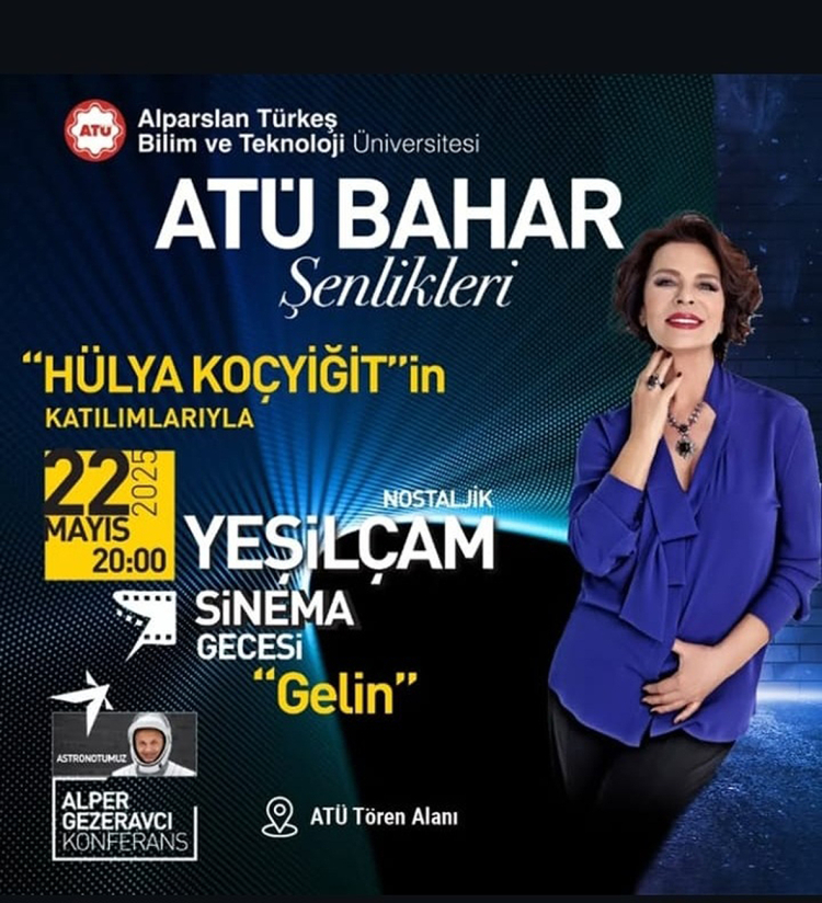 Alparslan Türkeş Bilim ve Teknoloji Üniversitesi (ATÜ) tarafından düzenlenen Bahar Şenlikleri kapsamında, Yeşilçam tutkunlarını nostaljik bir yolculuğa çıkaracak özel bir etkinlik gerçekleştirilecek. “Nostaljik Yeşilçam Sinema Gecesi” adıyla düzenlenecek gecede, Türk sinemasının duayen ismi Hülya Koçyiğit üniversite öğrencileri ve davetlilerle bir araya gelecek.