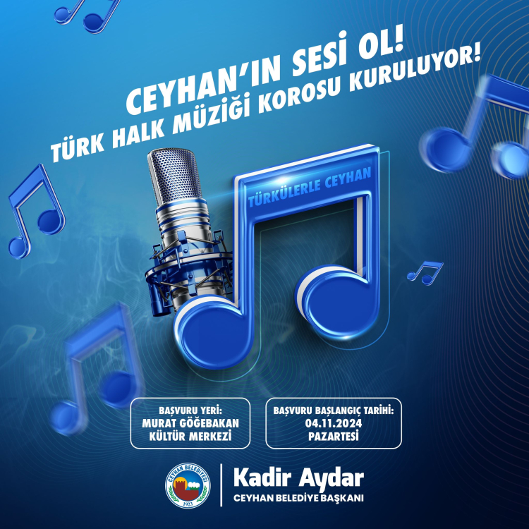 Ceyhan Belediyesi, ilçede kültürel faaliyetlere katkı sağlayacak bir projeye daha imza atarak Türk Halk Müziği korosu kurma hazırlığında. "Ceyhan’ın Sesi Ol" sloganıyla duyurulan koroya katılmak isteyenler, başvurularını Murat Göğebakan Kültür Merkezi'ne yapabilecek. Başvurular, 4 Kasım 2024 Pazartesi günü itibarıyla başladı.