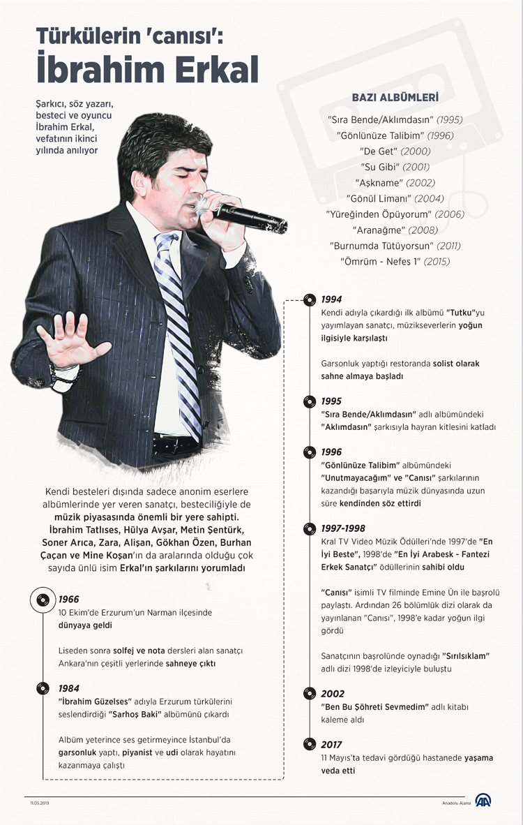Arabesk ve fantezi müziğin unutulmaz ismi İbrahim Erkal, vefatının 8. yılında sevenleri tarafından anılıyor. 11 Mayıs 2017'de hayatını kaybeden Erkal, geride "Canısı", "Unutmayacağım", "Sen Aldırma" gibi dillere pelesenk olmuş birçok eser bıraktı. Sanatçının yaşamı, eserleri ve ani ölümü, yıl dönümünde yeniden gündeme geldi.
