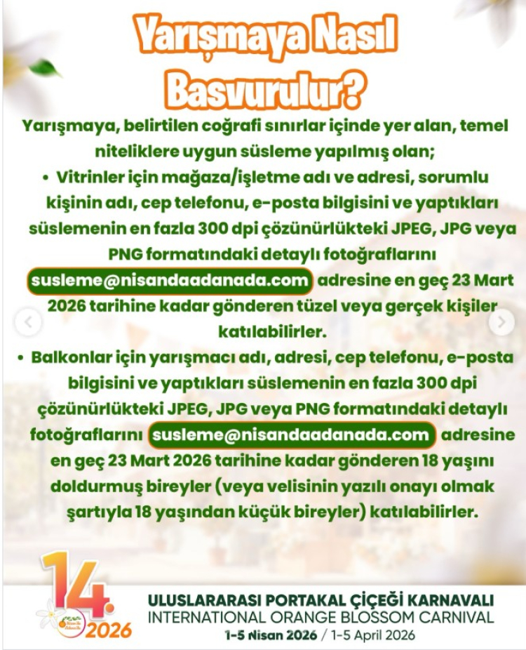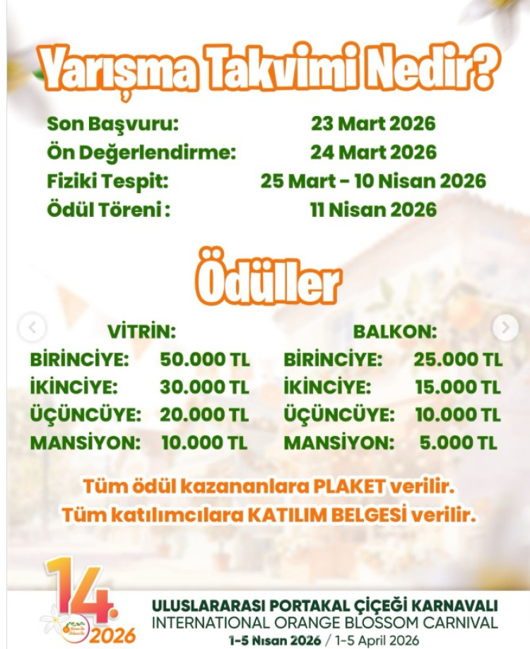 Organizasyon tarafından yapılan çağrıda, “Karnavalda siz de vitrininizi veya balkonunuzu süsleyerek şehrinizi güzelleştirin, yarışmaya katılın, ödül kazanma şansı yakalayın” ifadelerine yer verildi.