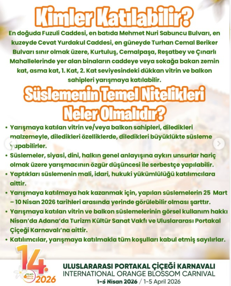 Uluslararası Portakal Çiçeği karnavalı kapsamında, “Adana Karnavalda Sizinle Güzelleşiyor” sloganıyla düzenlenen yarışmada vitrin ve balkonlar karnaval ruhuyla süslenecek, katılımcılar ödül kazanma şansı elde edecek.