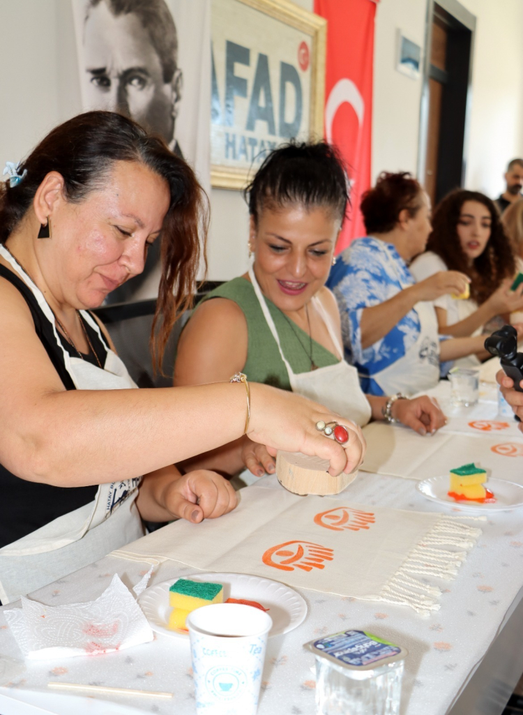 Hatay’da düzenlenen atölyede sanatseverler, ipek sanatçısı Yasemin Büyükaşık’ın rehberliğinde ahşap baskı tekniğiyle kumaşlara doğanın eşsiz izlerini işledi.