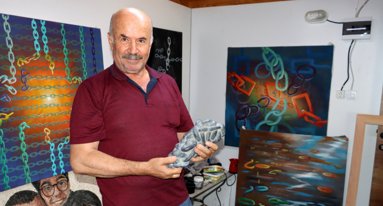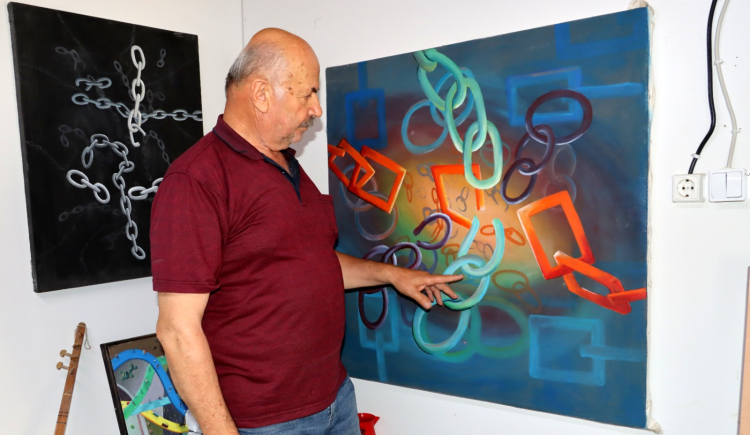 Hatay’daki Kültür Sanat Çarşısı’nda çalışmalarını sürdüren heykel ve mozaik sanatçısı Ahmet Bostancı, bu kez yağlı boya tablolarıyla sanat çevrelerinde dikkat çekiyor. Bostancı, zincir desenlerinin öne çıktığı eserlerinde motifleri yalnızca görsel bir öğe olarak değil, simgesel ve felsefi bir anlatım aracı olarak kullanıyor.