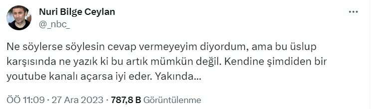 Nuri Bilge Ceylan ise Demirkubuz'un açıklamaları sonrası Twitter hesabından bir paylaşımda bulundu. Ceylan, paylaşımında, "Ne söylerse söylesin cevap vermeyeyim diyordum, ama bu üslup karşısında ne yazık ki bu artık mümkün değil. Kendine şimdiden bir YouTube kanalı açarsa iyi eder. Yakında..." ifadelerini kullandı.