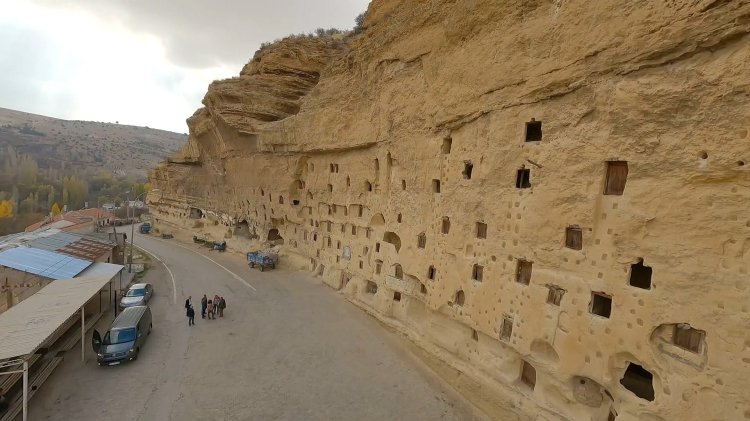 Karaman’ın Taşkale köyü yakınlarında bulunan Manazan Mağaraları, tamamen insan eliyle oyulmuş devasa bir kaya yerleşimi olup binlerce yıllık geçmişiyle Anadolu’nun en dikkat çekici kaya yaşam alanlarından biridir. Çok katlı yapısı, odaları, sığınakları ve tünelleriyle adeta doğal bir apartmanı andıran mağaralar, Roma ve Bizans dönemlerinde barınma ve savunma amaçlı kullanılmıştır.