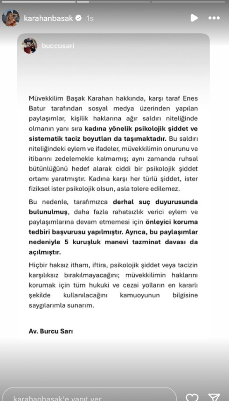Fenomen Başak Karahan, sosyal medya hesabından yaptığı açıklamada Enes Batur’a karşı 5 kuruşluk tazminat davası açtığını duyurdu. Karahan ayrıca avukatıyla birlikte koruma kararı sürecini başlattığını açıkladı.
