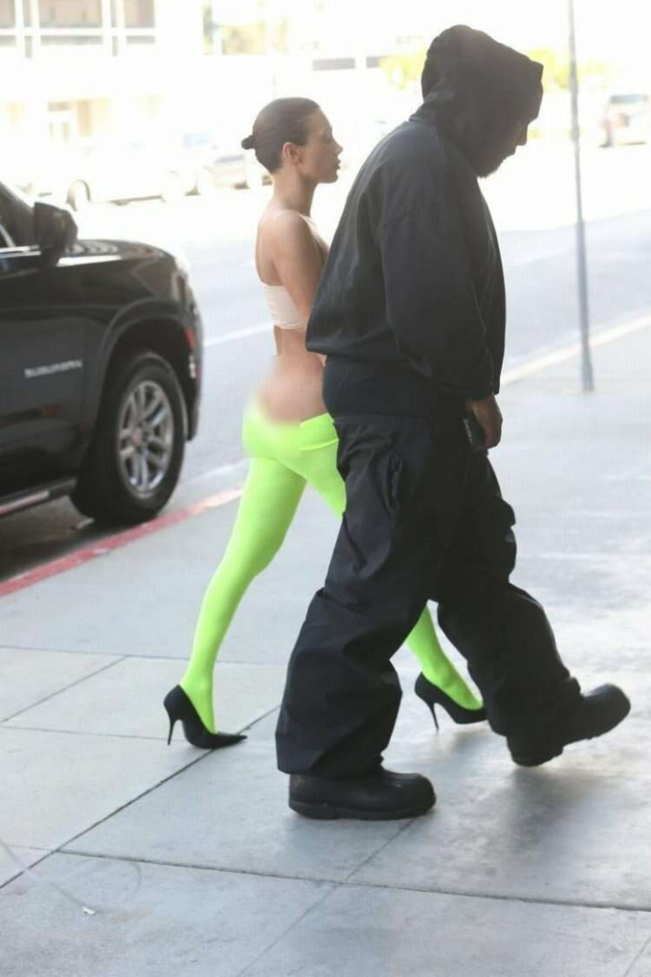 Los Angeles'taki The Grove'da gezinirken ve bir şeyler atıştırmak için aile restoranı The Cheesecake Factory'ye giderken görülen çift, çok açık görünümüyle yine baş döndürdü. Modacı neon yeşili taytını aşağı çekip sokaklarda öyle dolaşmaktan yine rahatsız olmadı.