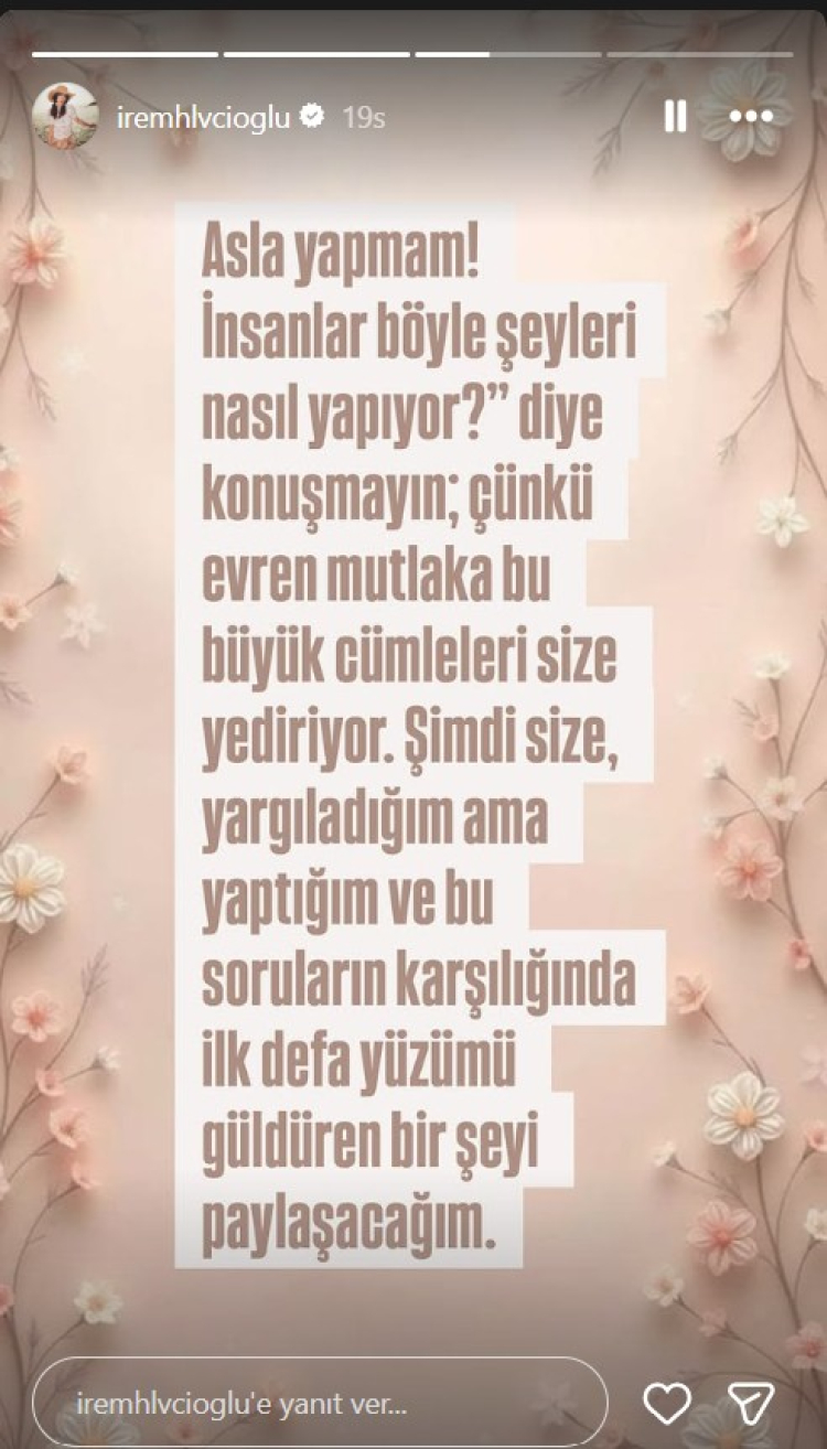 Tüm bu söylentilerin ardından İrem Helvacıoğlu’nun sosyal medya hesabından yaptığı paylaşım dikkat çekti. Ünlü oyuncu, önce kızının üçüncü ayına özel yapılan çekimden bir kare paylaştı. Ardından ise imalı ifadeler içeren bir mesaj yayımladı. Helvacıoğlu paylaşımında, “Asla yapmam! İnsanlar böyle şeyleri nasıl yapıyor?” diye yargılamamak gerektiğini vurgulayan ifadeler kullandı.