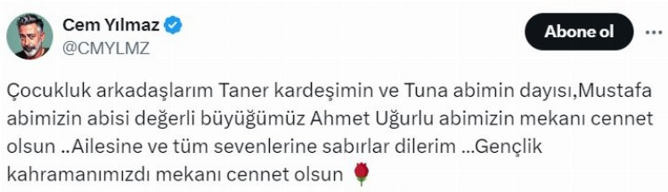 Türk sinema ve tiyatrosunun değerli ismi Ahmet Uğurlu, 72 yaşında hayatını kaybetti. Acı haberi ünlü komedyen Cem Yılmaz sosyal medya hesabından duyurdu. Yılmaz paylaşımında, "Çocukluk arkadaşlarım Taner kardeşimin ve Tuna abimin dayısı, Mustafa abimizin abisi değerli büyüğümüz Ahmet Uğurlu abimizin mekanı cennet olsun. Ailesine ve tüm sevenlerine sabırlar dilerim. Gençlik kahramanımızdı, mekanı cennet olsun" ifadelerini kullandı.