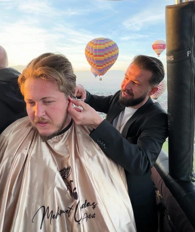 Denizli'nin ünlü kuaförü Mehmet Çağdaş, müşterisini havada 300 metre yükseklikten tıraş etti