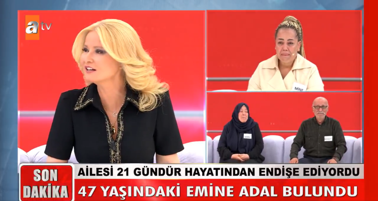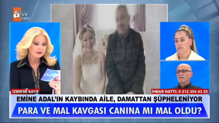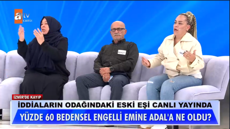 Müge Anlı'nın sunduğu programda, 21 gündür kaybolan ve ailesinin kayboluşuyla ilgili damadından şüphelendiği 47 yaşındaki Emine Adal, nihayet canlı yayına katıldı. Yüzde 60 bedensel engelli olan Emine, eski eşinin kendisini hem psikolojik hem de maddi olarak yıprattığını ve arabasını sattığını iddia etti.