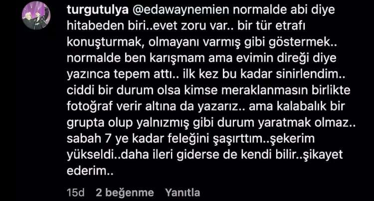 Ezhel ve Alizade arasında aşk yaşandığı iddiaları gündeme geldi. Alizade, sosyal medya hesabından “evimin direği” ve “enişteniz” notlarıyla fotoğraflar paylaştı. Söz konusu paylaşımlara kızgın surat emojisi gönderen ve Alizade’yi engellediğini söyleyen Ezhel’in annesi Ulya Turgut, “Ben sağken oğluma zade made yaklaşamaz" dedi