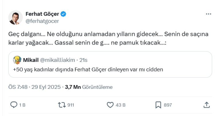 Geçtiğimiz saatlerde bir kullanıcının “50 yaş üstü kadınlar dışında Ferhat Göçer dinleyen var mı?” yorumunu gören ünlü sanatçı, tepki gösterdi. Ferhat Göçer, yaptığı paylaşımda, “Geç dalganı… Ne olduğunu anlamadan yılların geçecek, saçlarına karlar yağacak… Gassal senin de g*tüne pamuk tıkayacak” ifadelerini kullandı.