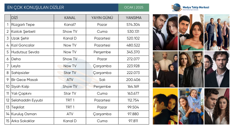 MTM Medya Takip Merkezi'nin verilerine göre, Ocak 2025'te Türkiye'nin en çok konuşulan dizisi "Rüzgârlı Tepe" oldu. İkinci sırada "Kızılcık Şerbeti", üçüncü sırada ise "Uzak Şehir" yer aldı. Pazartesi günleri yayımlanan diziler ise en çok ilgi gören yapımlar arasında.