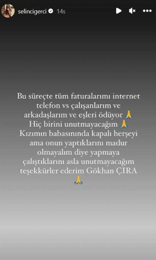 Selin Ciğerci, eski kocası Gökhan Çıra'nın da aynı durumda olduğunu ama kendisi için çabaladığını ifade ederek ona da teşekkür etti.