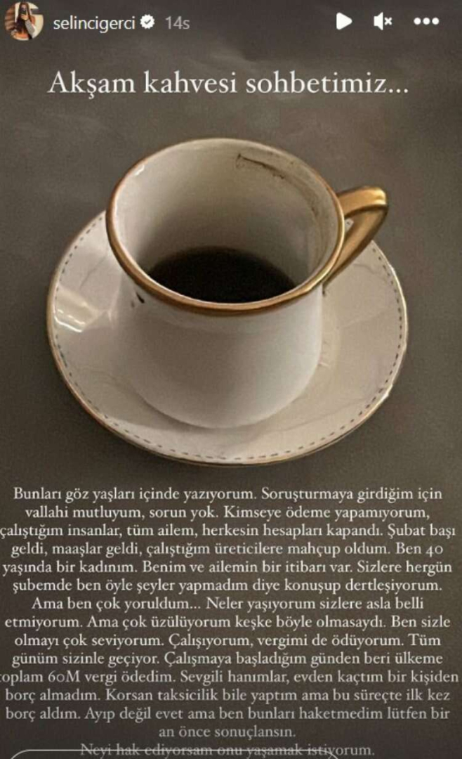 Ağlayarak takipçilerine dert yanan Selin Ciğerci, "Soruşturmaya girdiğim için vallahi mutluyum" dedi. Ciğerci "Kimseye ödeme yapamıyorum, çalıştığım insanlar, tüm ailem, herkesin hesapları kapandı. Şubat geldi maaşlar geldi, çalıştığım üreticilere mahcup oldum. Ben 40 yaşında bir kadınım benim ve ailemin bir itibarı var" dedi.