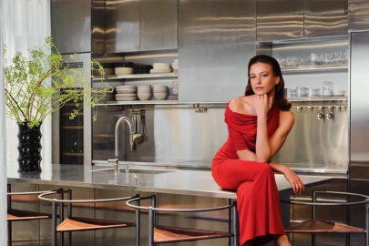Sarıkaya'nın mutfağı, misafirlerini ağırlamak için ideal bir alan sunuyor. Mimar Karavil, "Paslanmaz çelik kullanarak profesyonel bir mutfağın görünümünü elde etmek istedik. Minimalist bir yaklaşım ile özel kahverengi deri bar tabureleriyle şık bir yemek alanı oluşturduk," dedi.