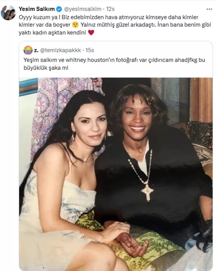 Şarkıcı ve oyuncu Yeşim Salkım’ın, 2012 yılında hayatını kaybeden efsanevi sanatçı Whitney Houston ile çekilmiş eski bir fotoğrafı sosyal medyada gündem yarattı. Bir sosyal medya kullanıcısının "Yeşim Salkım ve Whitney Houston fotoğrafı var, çıldıracağım! Bu büyüklük şaka mı?" paylaşımı, kısa sürede geniş yankı uyandırdı.