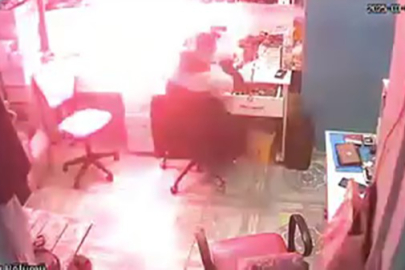 Adana'nın Yüreğir ilçesinde bataryası şişen bir telefon tamirci tarafından bırakıldığı masada patladı ve alev aldı. O anlar güvenlik kameralarına saniye saniye yansıdı.