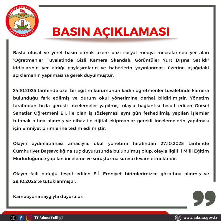 Adana’da özel bir eğitim kurumunda kadın öğretmenler tuvaletinde gizli kamera bulunmasıyla ve bazı basın organları ve sosyal medya hesaplarında “Görüntüler yurt dışına satıldı” iddialarının yayılması üzerine Adana Valiliği, kamuoyunu bilgilendirmek amacıyla yazılı açıklama yaptı. Valilik, 24 Ekim 2025’te tespit edilen olayla ilgili okul yönetiminin hızlıca harekete geçtiğini, kamera yerleştirdiği belirlenen görsel sanatlar öğretmeni E.İ.’nin aynı gün işten çıkarıldığını ve cihazların emniyete teslim edildiğini duyurdu.