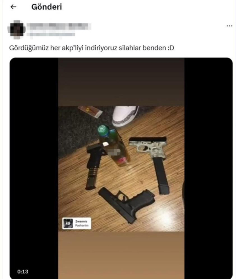 Sivas’ta sosyal medya üzerinden silah ifşası yaparak AK Partililere yönelik tehdit içeren paylaşımlarda bulunan B.G. adlı şahıs, polis ekipleri tarafından gözaltına alındı. "Gördüğümüz her AKP'liyi indiriyoruz, silahlar benden: D" şeklinde paylaşım yaptığı belirlenen B.G., emniyetteki işlemlerinin ardından adliyeye sevk edildi.