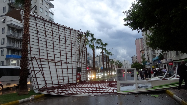 Perge Bulvarı üzerinde bulunan bir apartmanın çatısı, şiddetli rüzgara dayanamayarak tonlarca ağırlığıyla yola savruldu. Olay sırasında yoldan geçen bir araç ya da yaya olmaması olası bir faciayı önledi.
