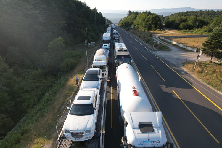 Bolu Dağı'nda sabah saatlerinde 4 aracın karıştığı ve bir tırın otomobilin üzerine devrildiği kaza, trafik yoğunluğuna neden oldu. Kaza sonrası oluşan kilometrelerce uzunluktaki araç kuyruğu dron ile görüntülendi.