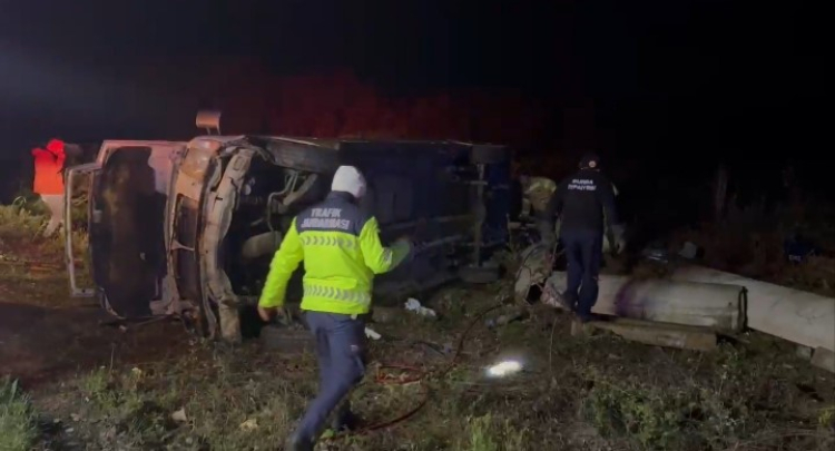 Özel bir şirkete ait olan 16 H 1803 plakalı yolcu minibüsü, sürücüsünün direksiyon hakimiyetini kaybetmesi sonucu yolun sol tarafına devrildi.