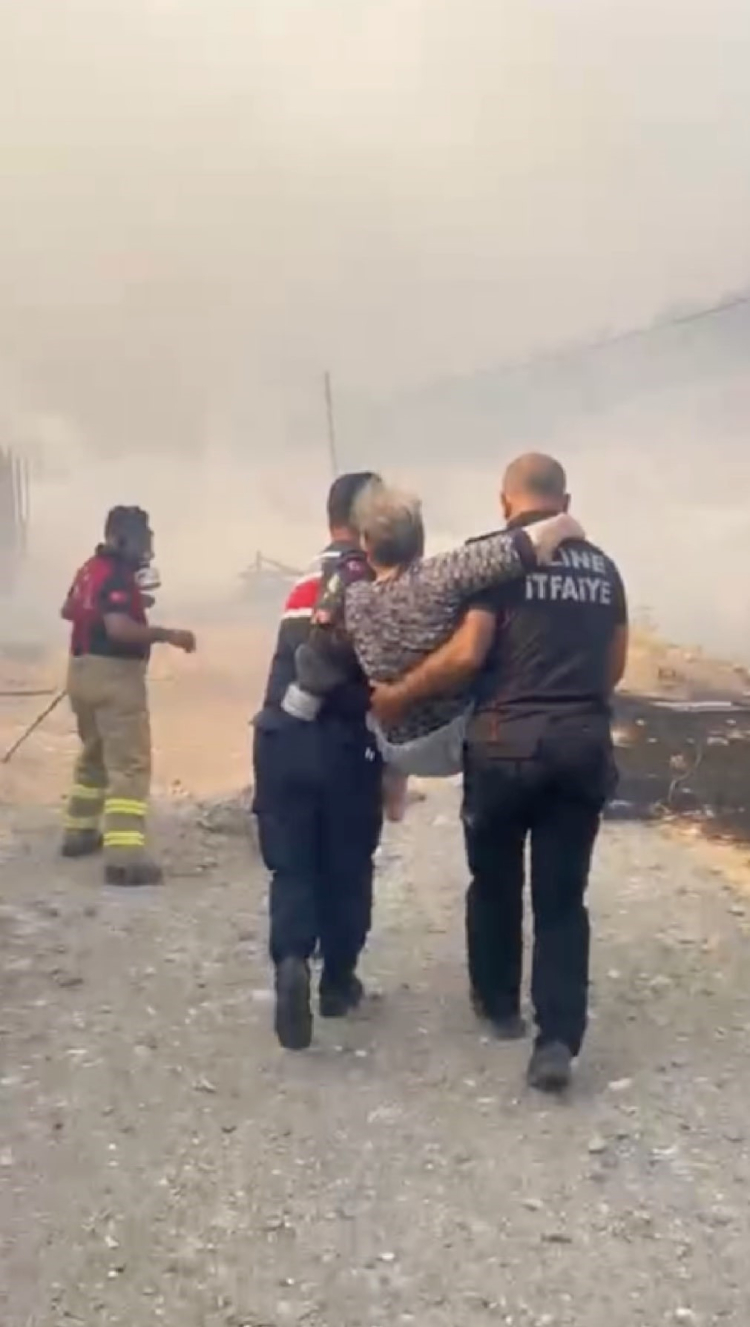 Tuzla köyünde tahliyeler sırasında yaşanan dramatik bir an, yangının ciddiyetini bir kez daha gözler önüne serdi. Evine kadar yaklaşan alevlerden dolayı yürüyemeyen yaşlı bir kadın, Ezine Belediyesi itfaiye ekipleri ve jandarma personeli tarafından omuzlara alınarak güvenli bölgeye taşındı.