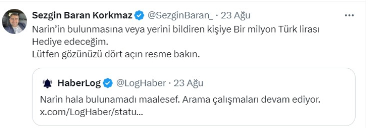 Türkiye'de kara para aklamak suçlamasıyla hakkında arama kararı bulunan Sezgin Baran Korkmaz, sosyal medya üzerinden Narin Güran’ın bulunması için bir milyon Türk Lirası ödül teklif etti. Korkmaz, "Narin’in bulunmasına veya yerini bildiren kişiye bir milyon Türk Lirası hediye edeceğim. Lütfen gözünüzü dört açın, resme bakın" şeklinde çağrıda bulundu.