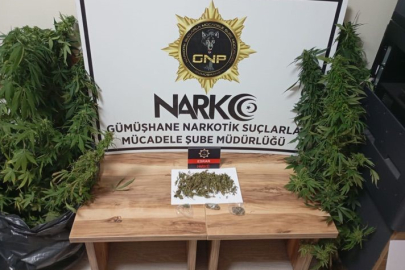 Gümüşhane İl Emniyet Müdürlüğü Narkotik ekipleri, Hasanbey Mahallesi'nde S.D. isimli şahsın evinde yaptığı aramada 7 kök yasaklı madde ve 34,54 gram kurutulmuş yasaklı madde ele geçirdi.