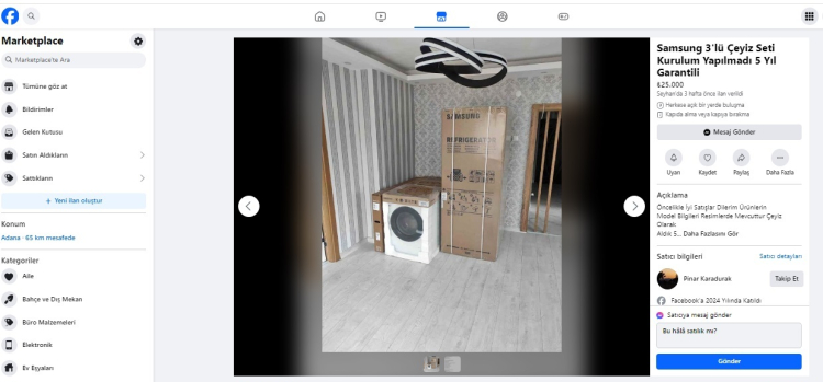 Geçtiğimiz günlerde bir sosyal medya hesabından çamaşır makinesi, buz dolabı ve bulaşık makinesi ilanı paylaşıldı. Bu ilanda nişan attığından dolayı eşyaları satacağı bilgileri yer aldı. Paylaşan kişinin profilinde yer alan fotoğraf bir kadına aitti. İnsanlar verilen telefon ile irtibata geçtiğinde verilen telefonda bir erkek ile karşılaştı.