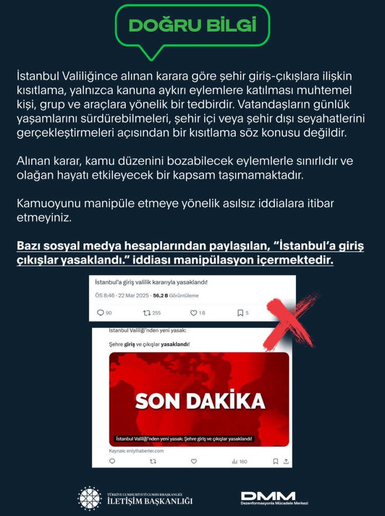 CİB: ''Bazı sosyal medya hesaplarından paylaşılan, “İstanbul’a giriş çıkışlar yasaklandı.” iddiası manipülasyon içermektedir. İstanbul Valiliğince alınan karara göre şehir giriş-çıkışlara ilişkin kısıtlama, yalnızca kanuna aykırı eylemlere katılması muhtemel kişi, grup ve araçlara yönelik bir tedbirdir. Vatandaşların günlük yaşamlarını sürdürebilmeleri, şehir içi veya şehir dışı seyahatlerini gerçekleştirmeleri açısından bir kısıtlama söz konusu değildir. Alınan karar, kamu düzenini bozabilecek eylemlerle sınırlıdır ve olağan hayatı etkileyecek bir kapsam taşımamaktadır. Kamuoyunu manipüle etmeye yönelik asılsız iddialara itibar etmeyiniz.''