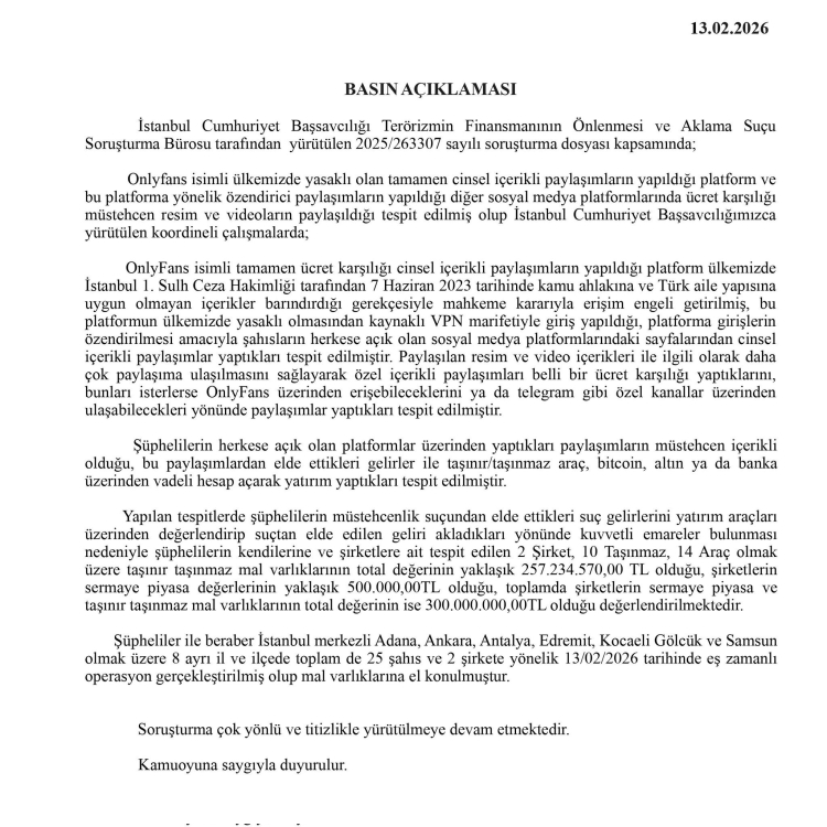 Soruşturma kapsamında İstanbul merkezli 8 ilde eş zamanlı operasyon düzenlendi. Operasyonlarda 16 şüpheli gözaltına alındı. Şüphelilerin, erişim engeli bulunan platform üzerinden içerik üretip gelir elde ettikleri ve bu gelirleri akladıkları değerlendiriliyor.